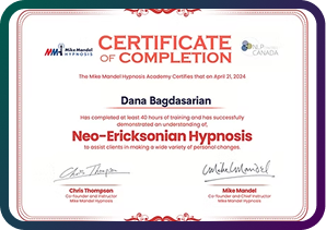Working with Dana has been an incredibly rewarding experience. Her expertise in hypnotherapy, coupled with tools like EFT/TFT, has truly empowered me to strive towards becoming the best version of myself. One of Dana's standout qualities is her hypnotic voice, which instantly puts you at ease and facilitates a deep state of relaxation. I highly recommend Dana to anyone seeking a skilled practitioner who is dedicated to their clients' well-being.
